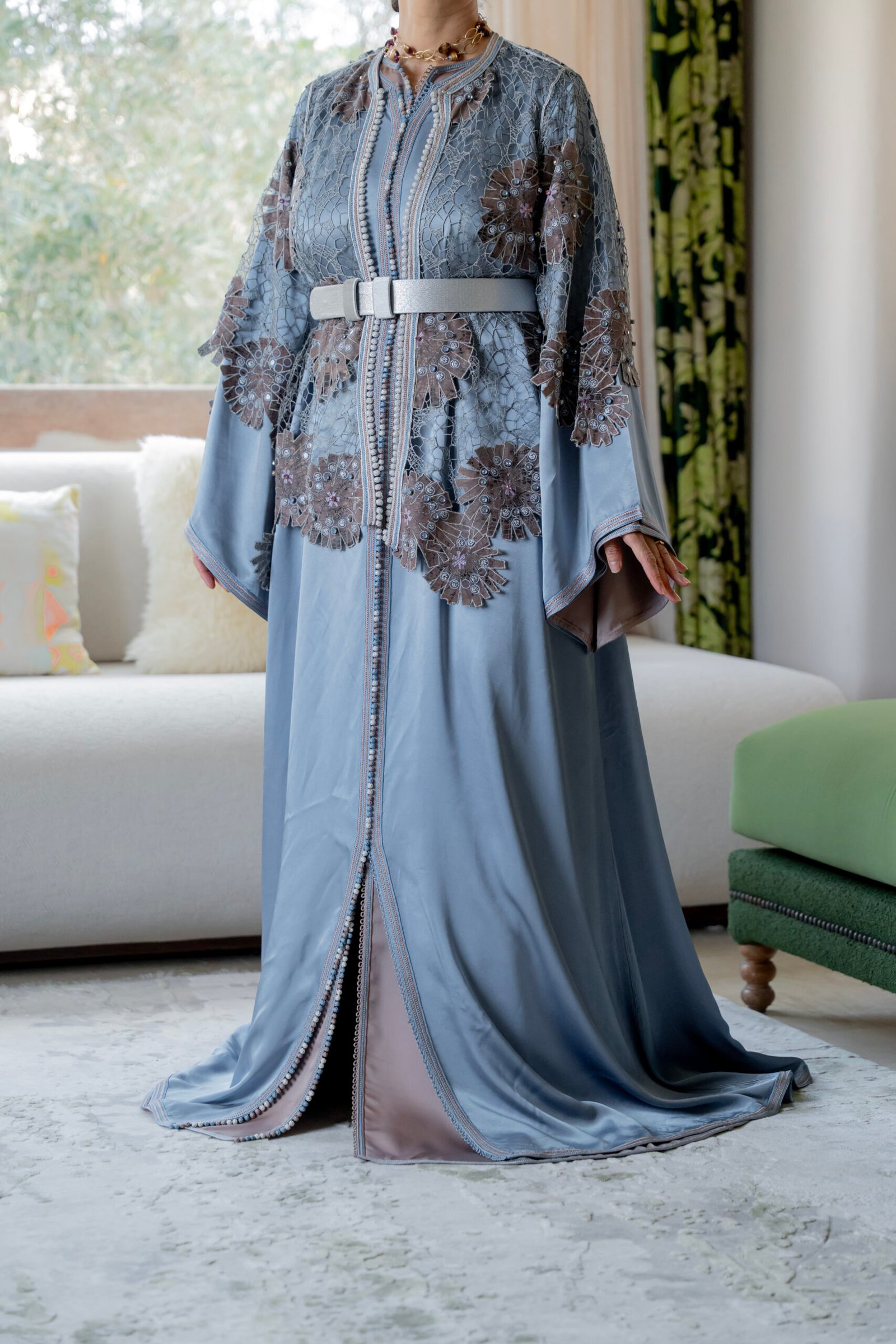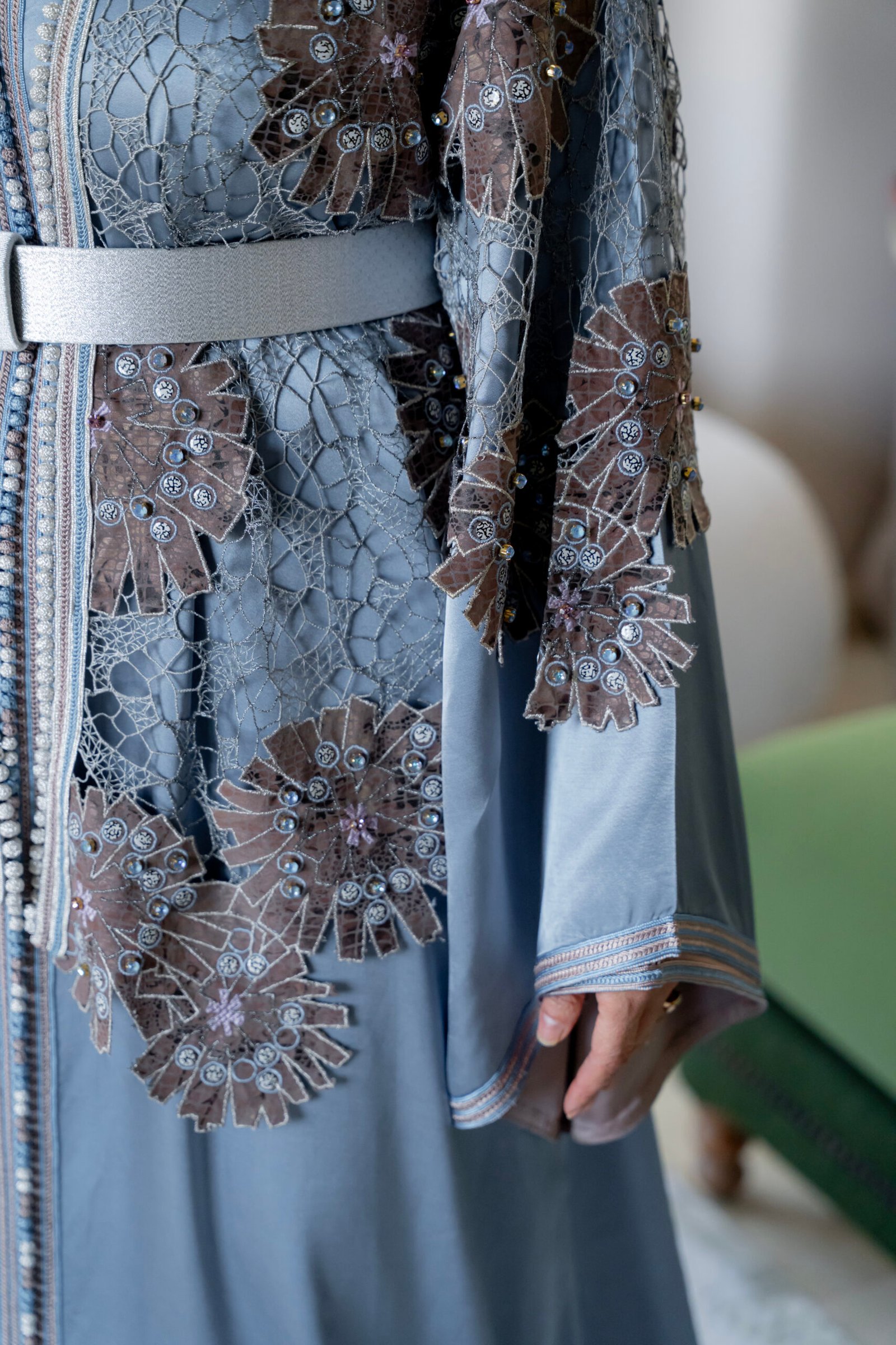 A soft blue silhouette enhanced by sculptural floral textures, balancing fluidity with structured detail and quiet refinement.