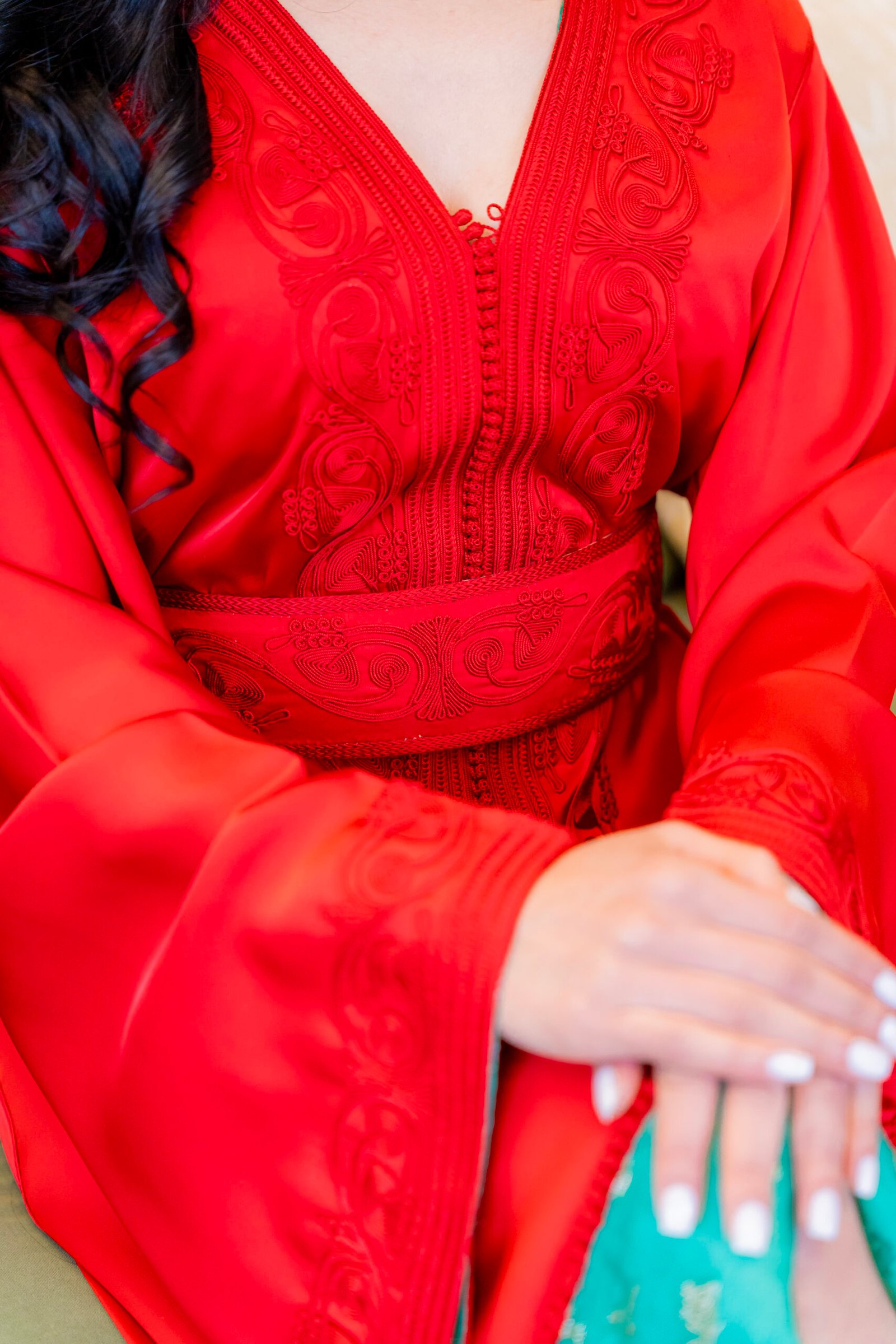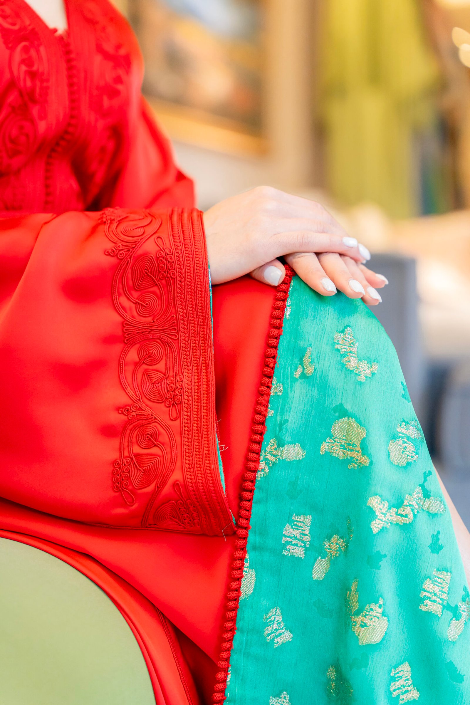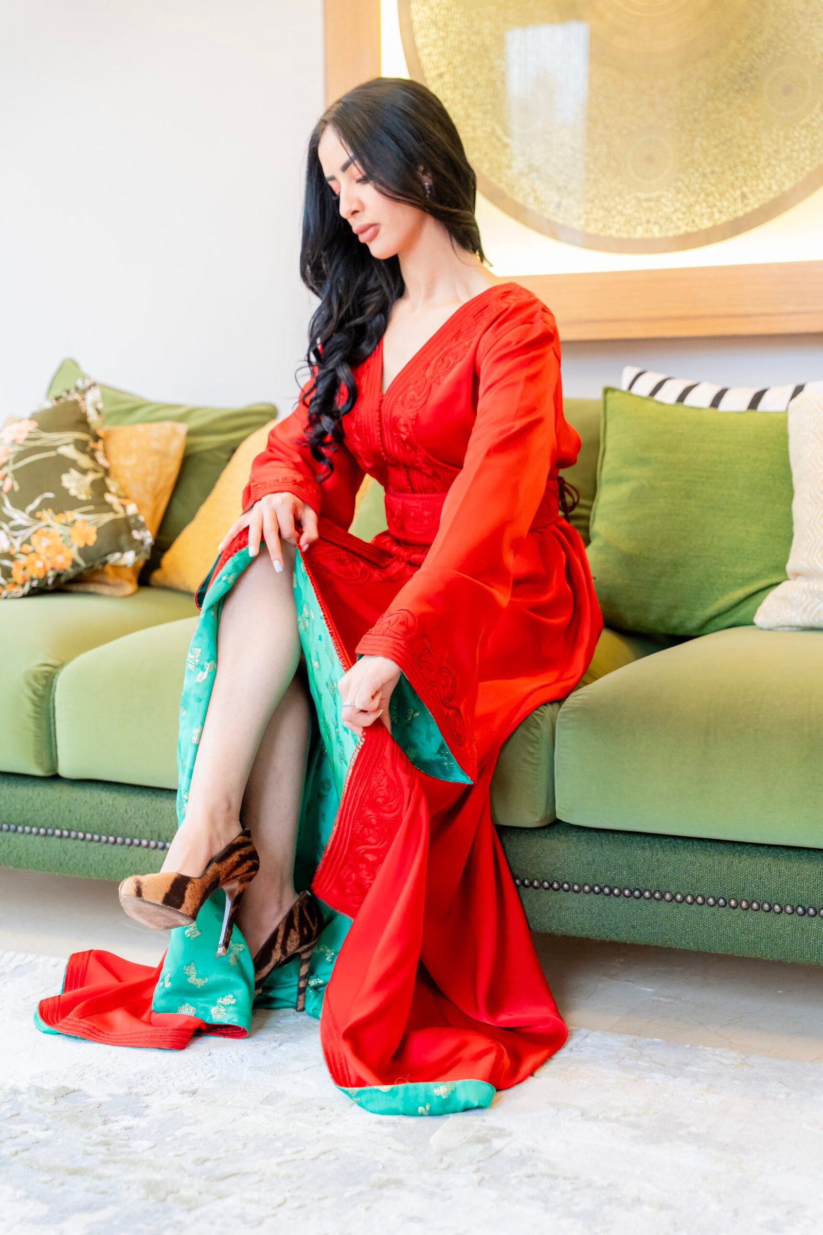 The red is clean and saturated, giving the caftan a strong, defined presence. But it’s the interior that shifts the perception — flashes of green appear as the fabric opens, adding depth and a sense of layering that feels intentional rather than decorative.