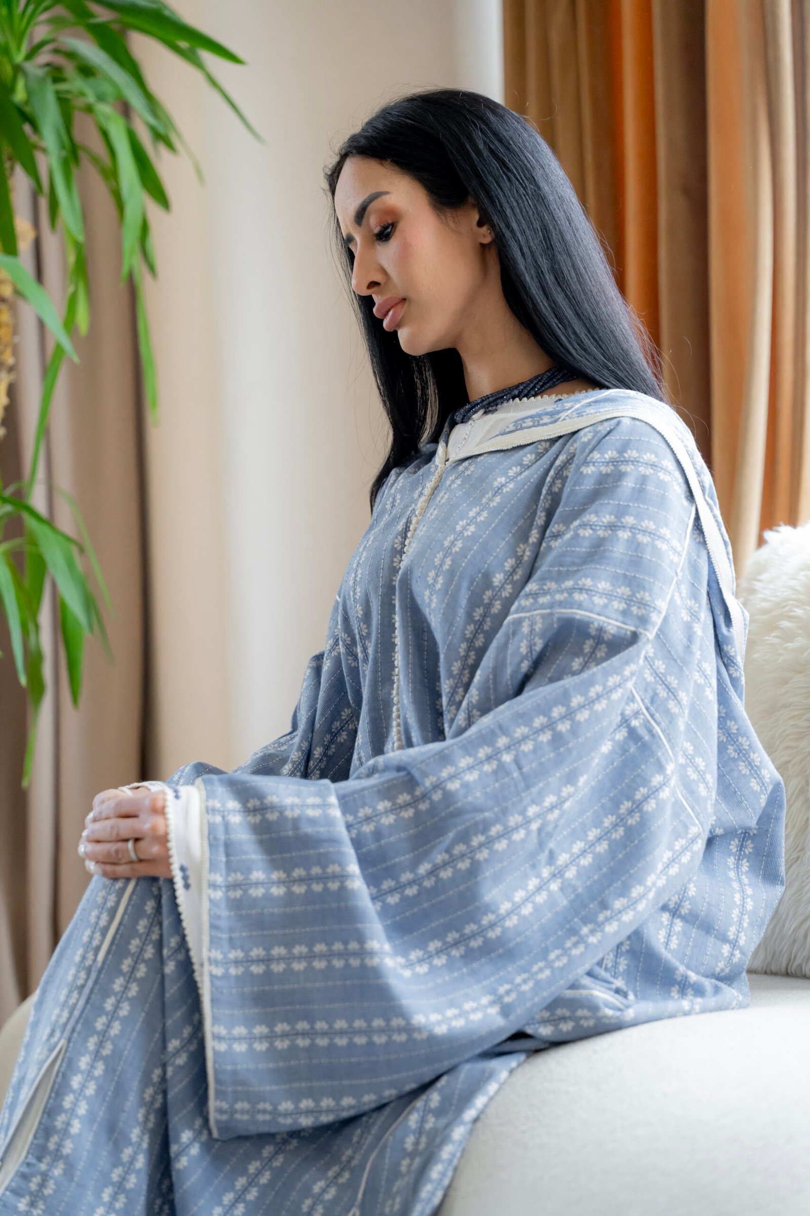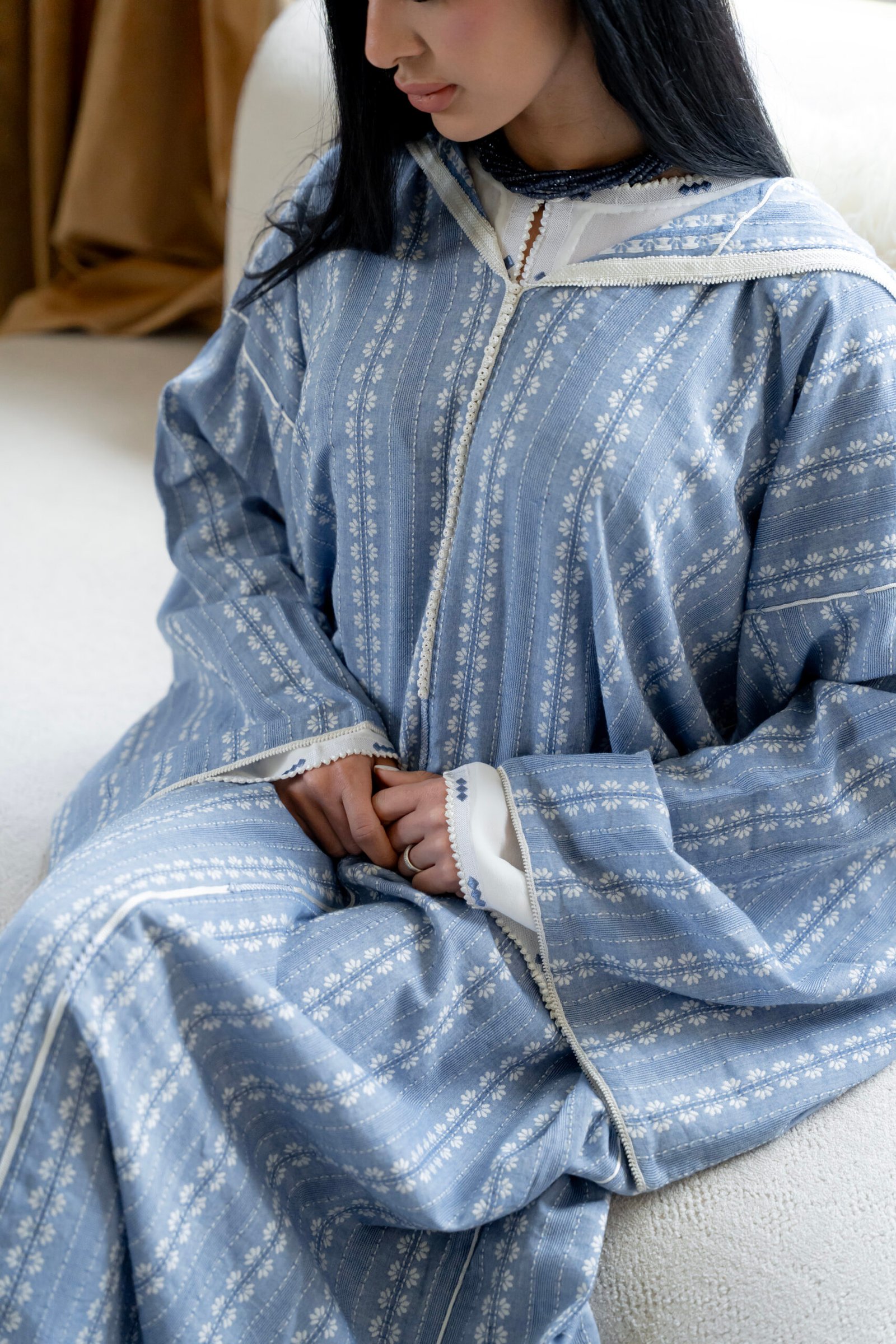 A soft, flowing silhouette defined by a muted blue tone and delicate repeating motifs that create a quiet visual rhythm across the surface. The fabric feels light yet structured, holding its shape while moving naturally with the body.