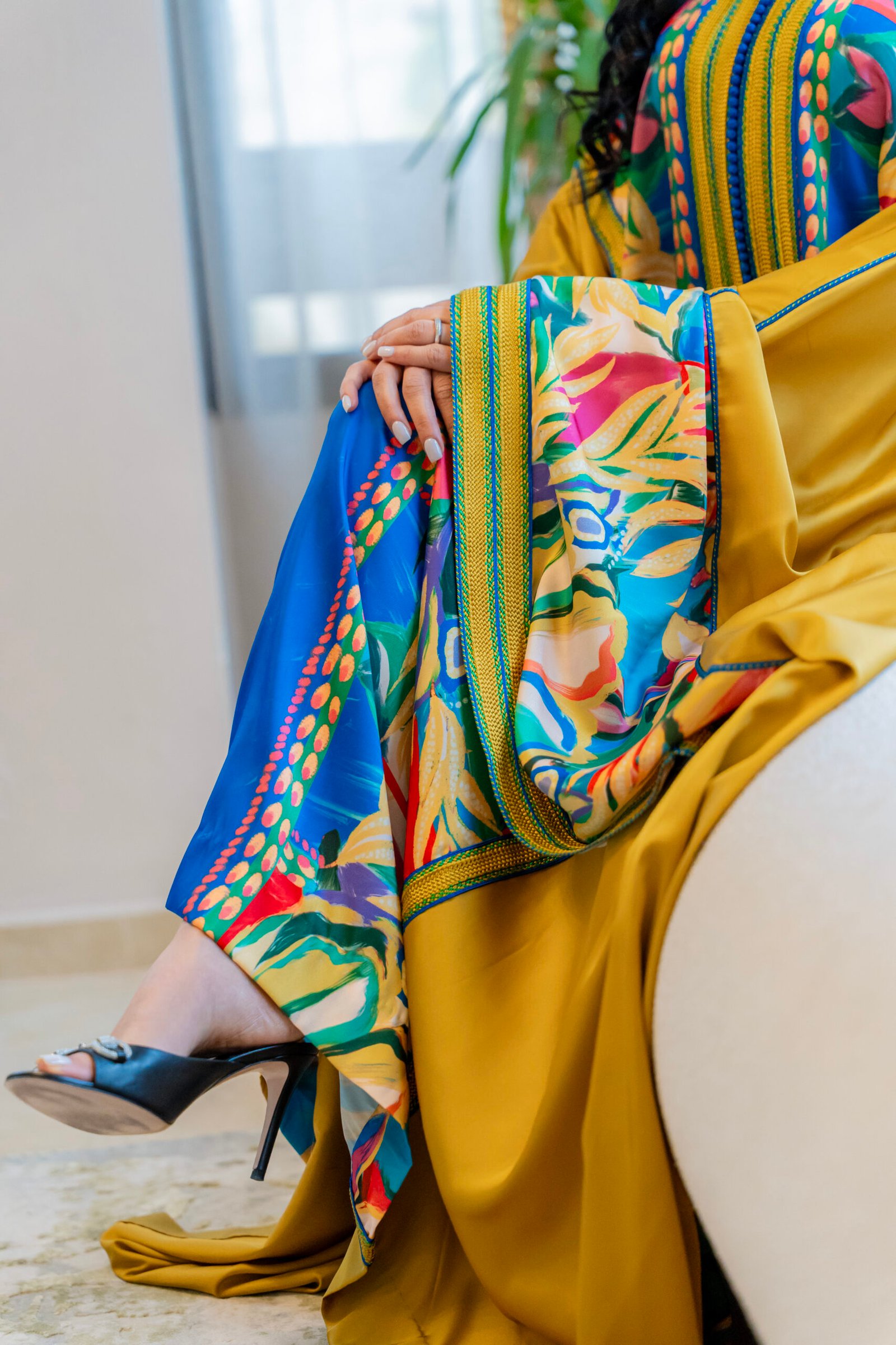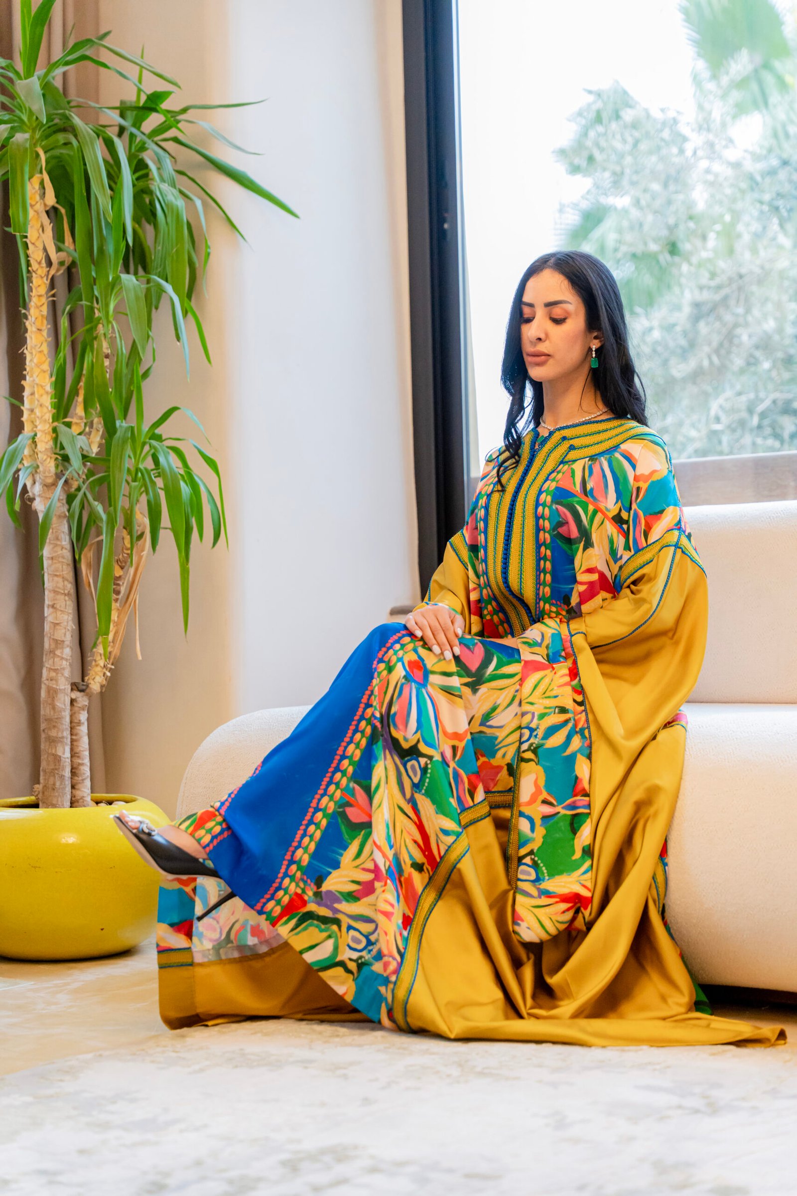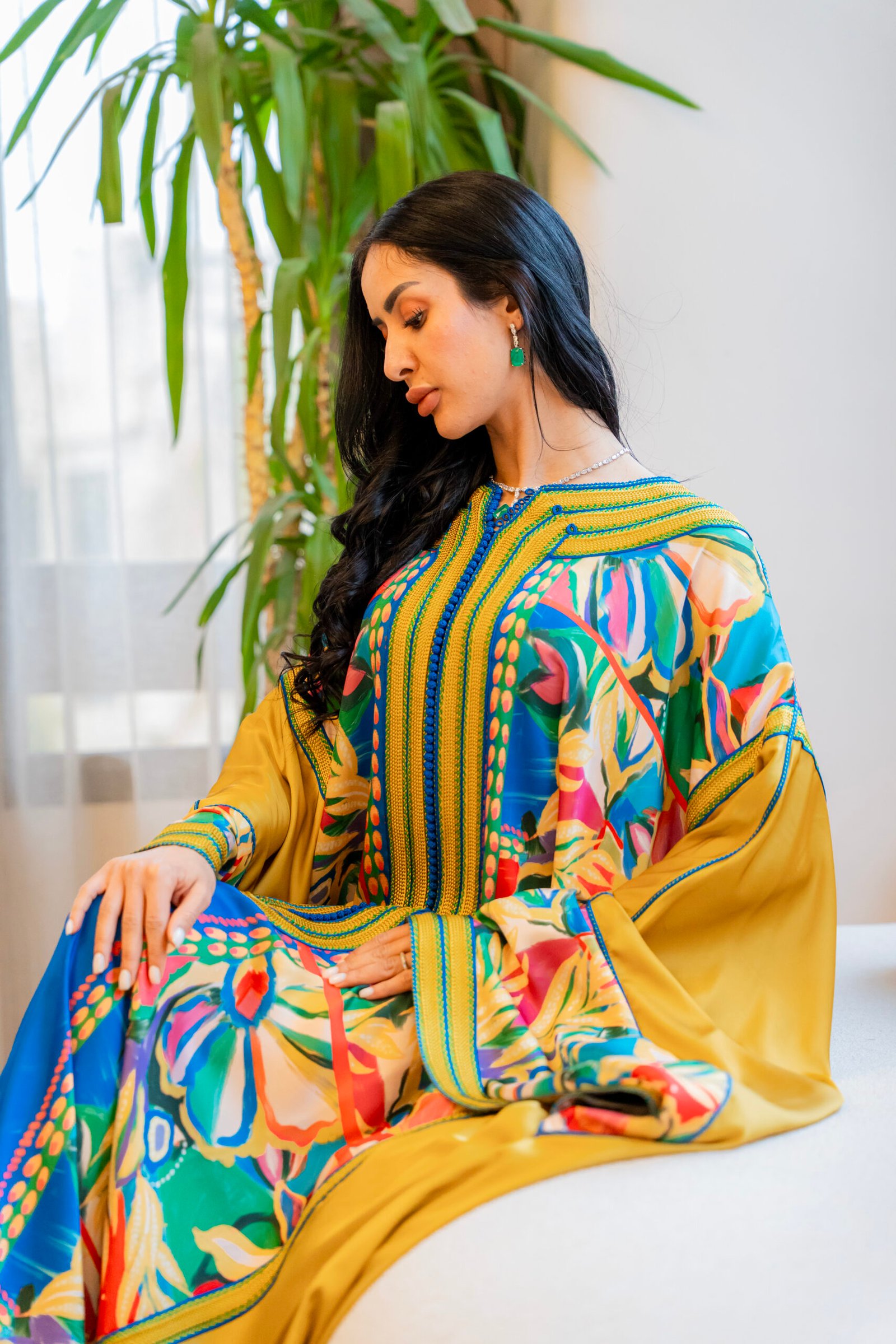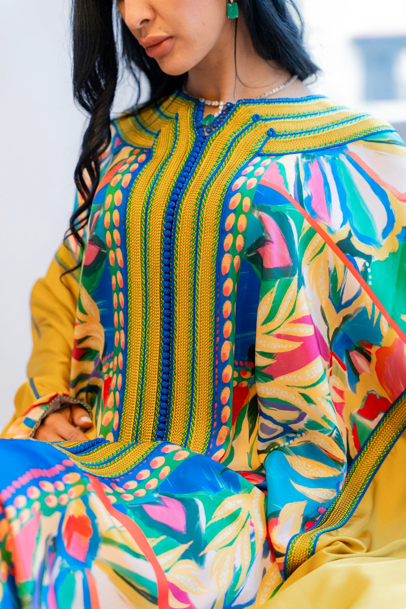 This is a caftan built around warmth and color — where structure and movement come together in a vibrant, controlled balance.