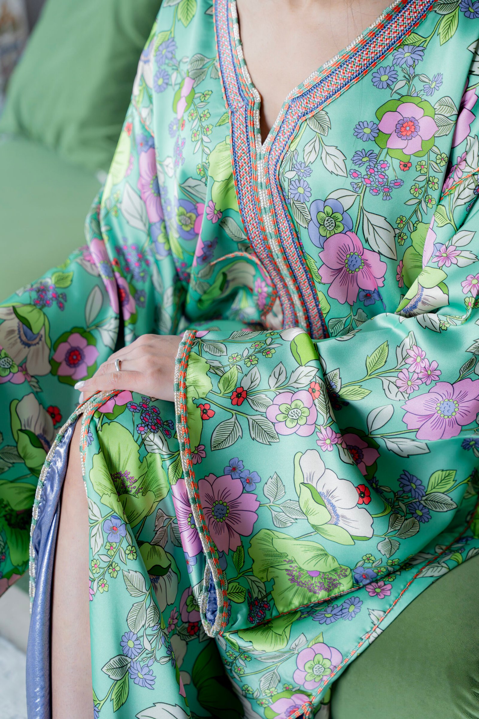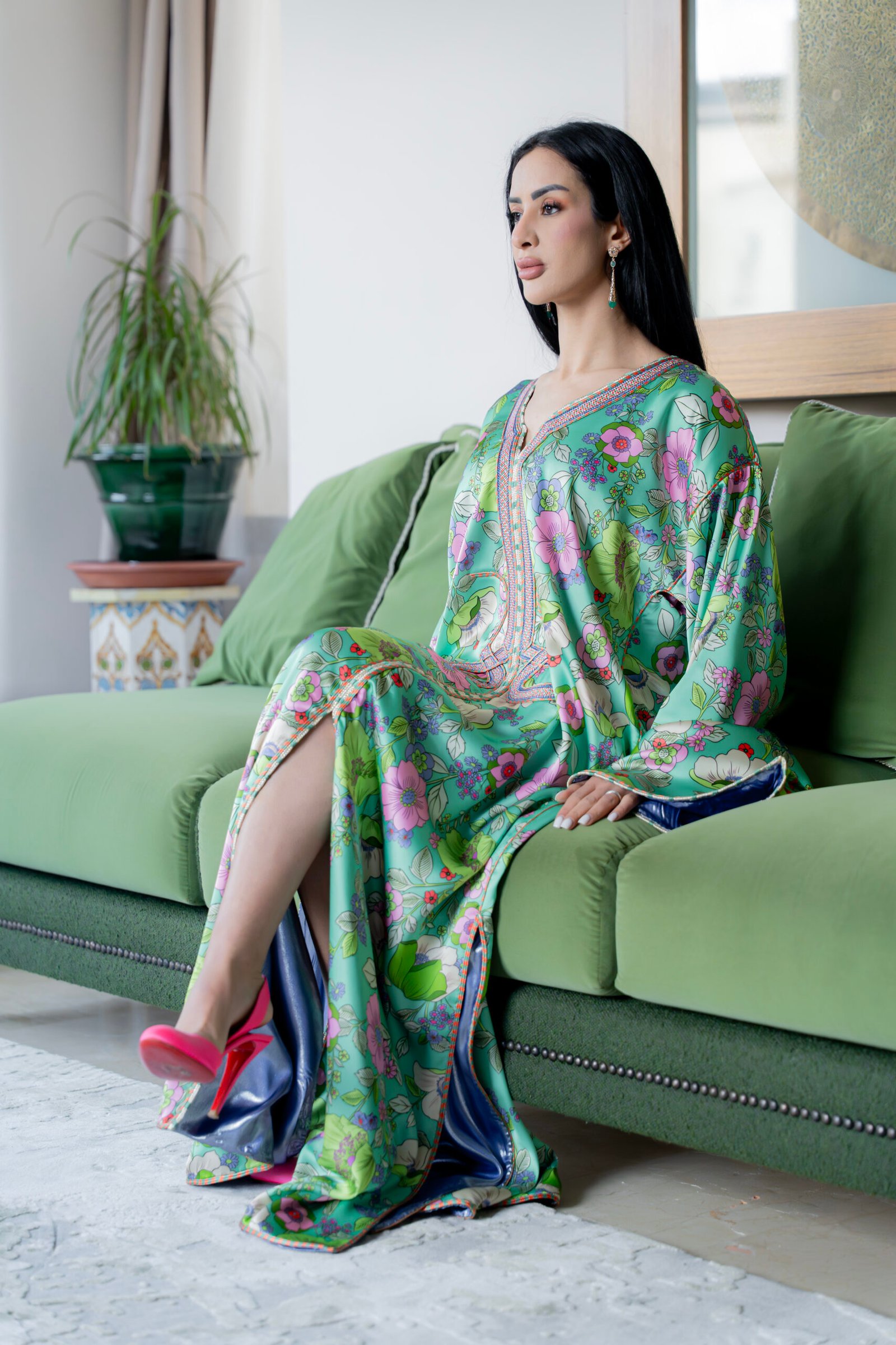 A vibrant aqua satin caftan with multicolored floral prints and refined embroidered detailing, combining fluid elegance with a bold botanical expression.