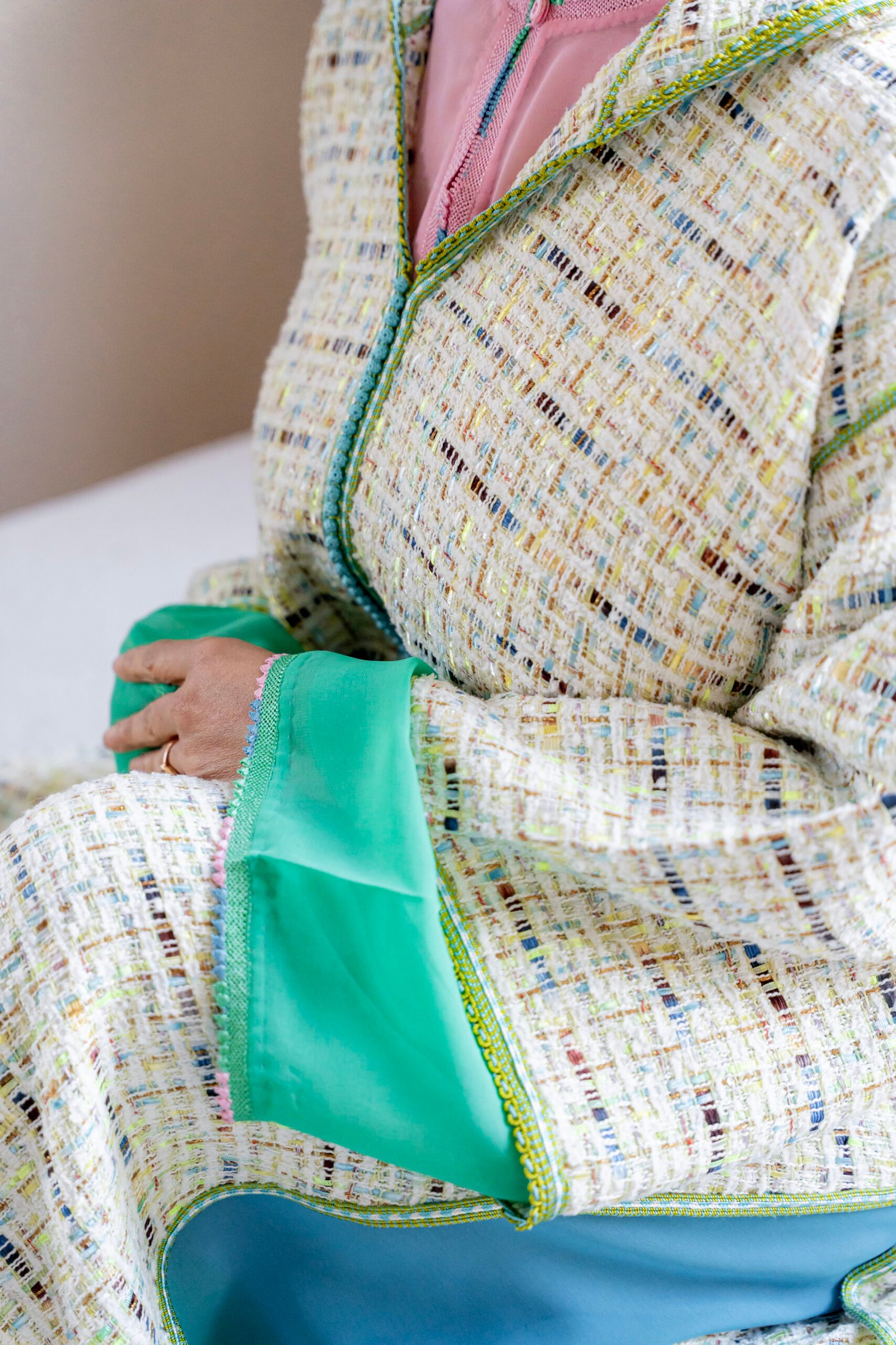 The cut remains controlled and elegant, allowing the material to hold its form without stiffness. Along the front, a clean Moroccan finish introduces a vertical line that brings clarity and balance to the silhouette.