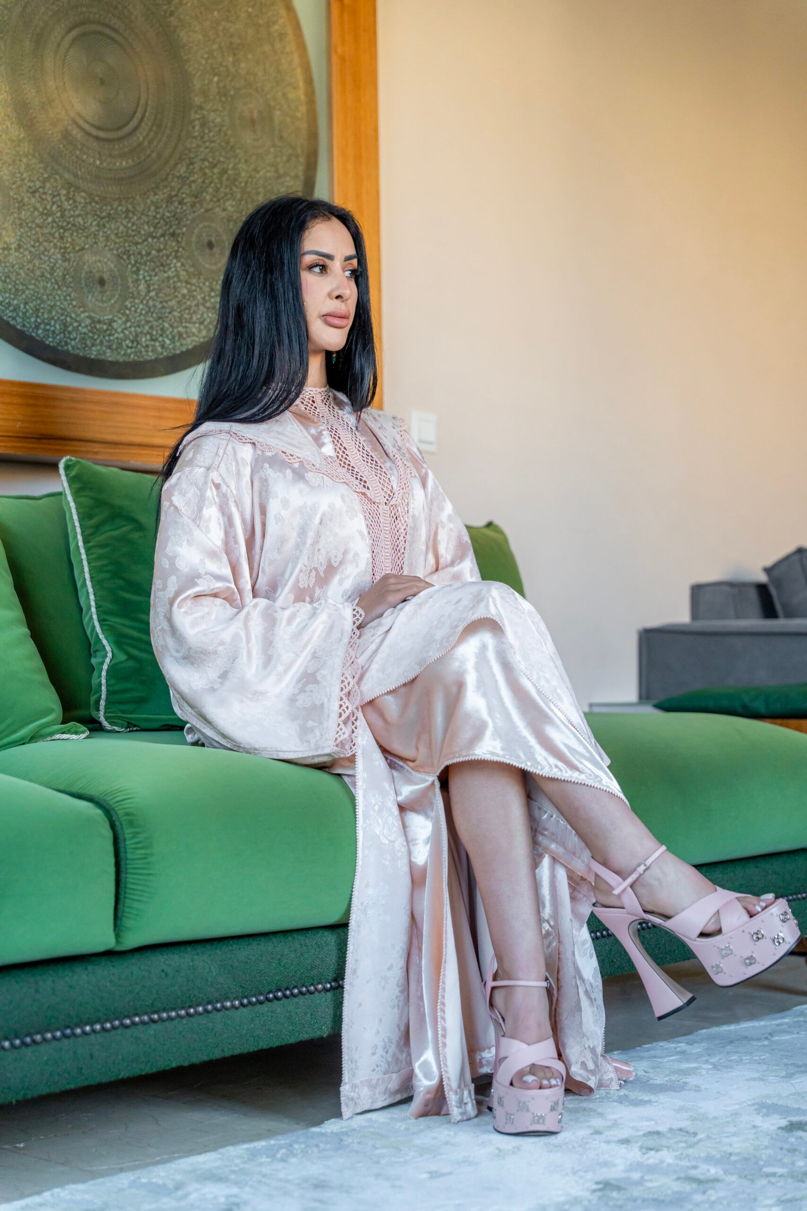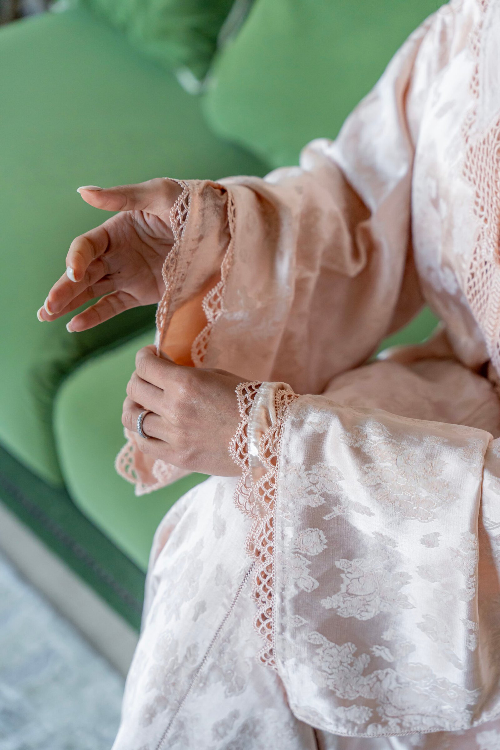 Luminous rose-toned volume enriched with Moroccan floral texture and lace, balancing softness and structure through fluid shine.