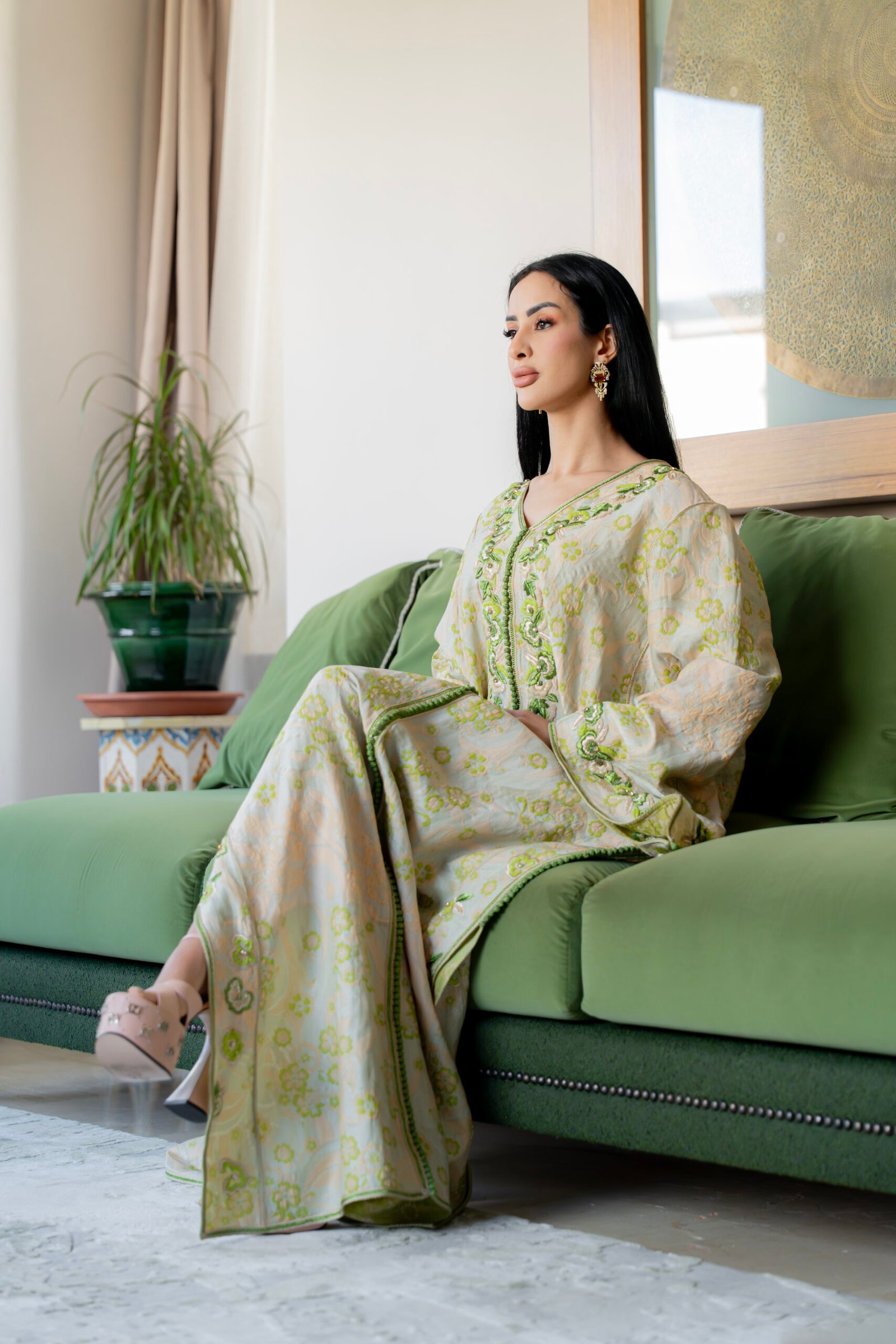 A fluid caftan crafted from a luminous jacquard fabric where soft sage tones blend with delicate floral motifs in light green and ivory. The texture reveals a subtle interplay of matte and sheen, giving depth and movement to the silhouette with every gesture. The embroidery follows the natural lines of the garment, enhancing the neckline and cuffs with refined floral detailing in tonal greens, creating a harmonious and elevated visual rhythm.