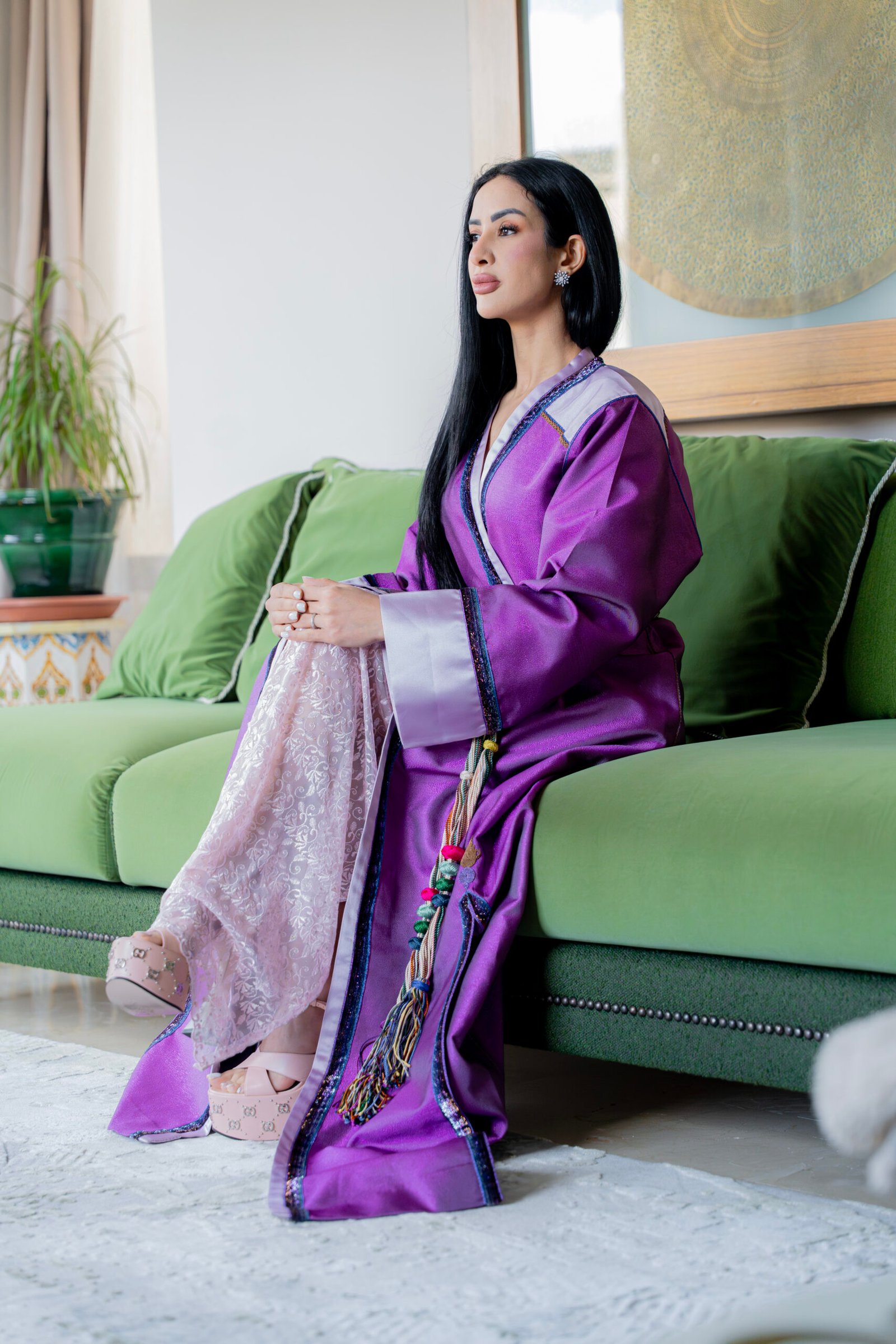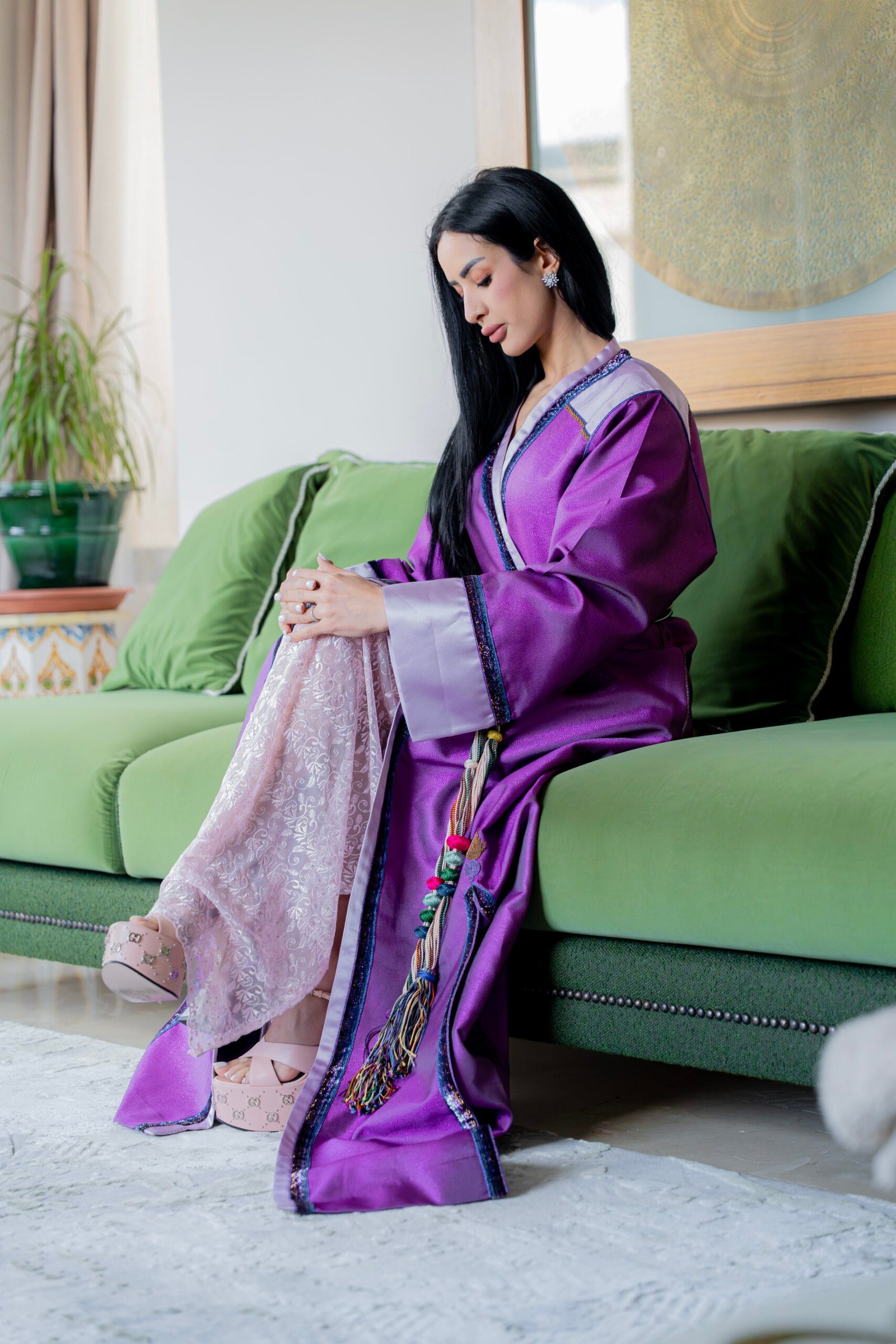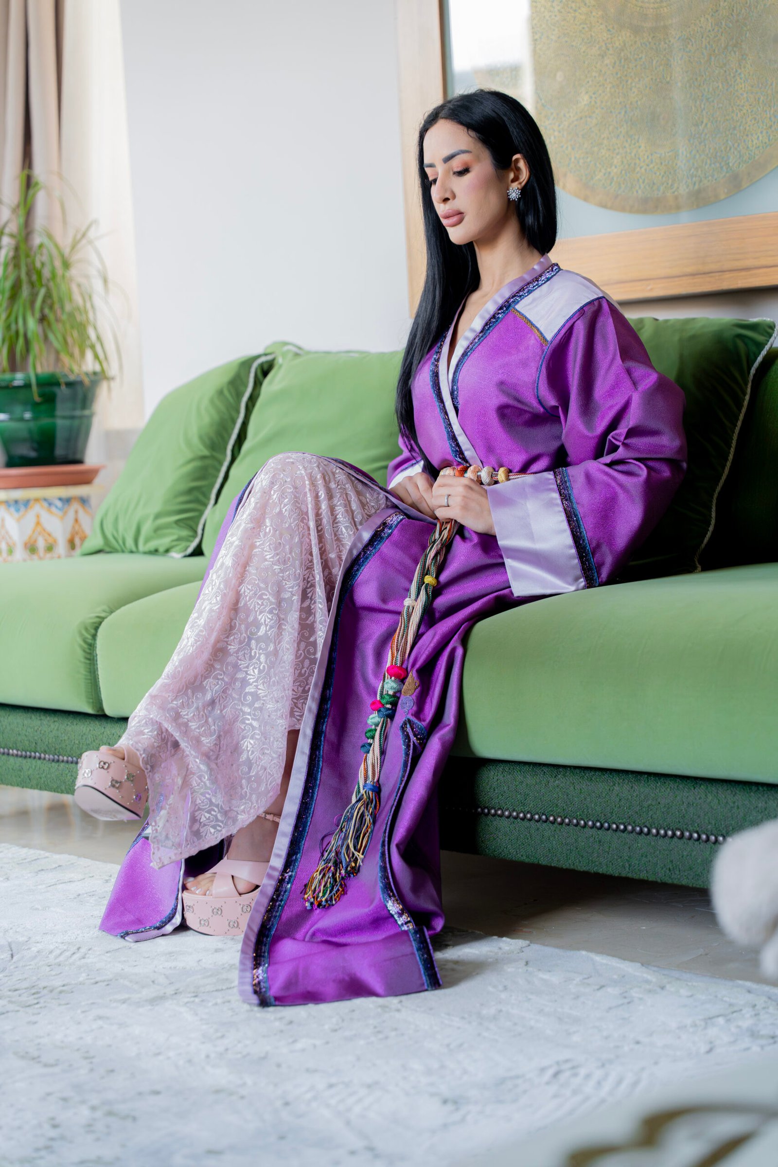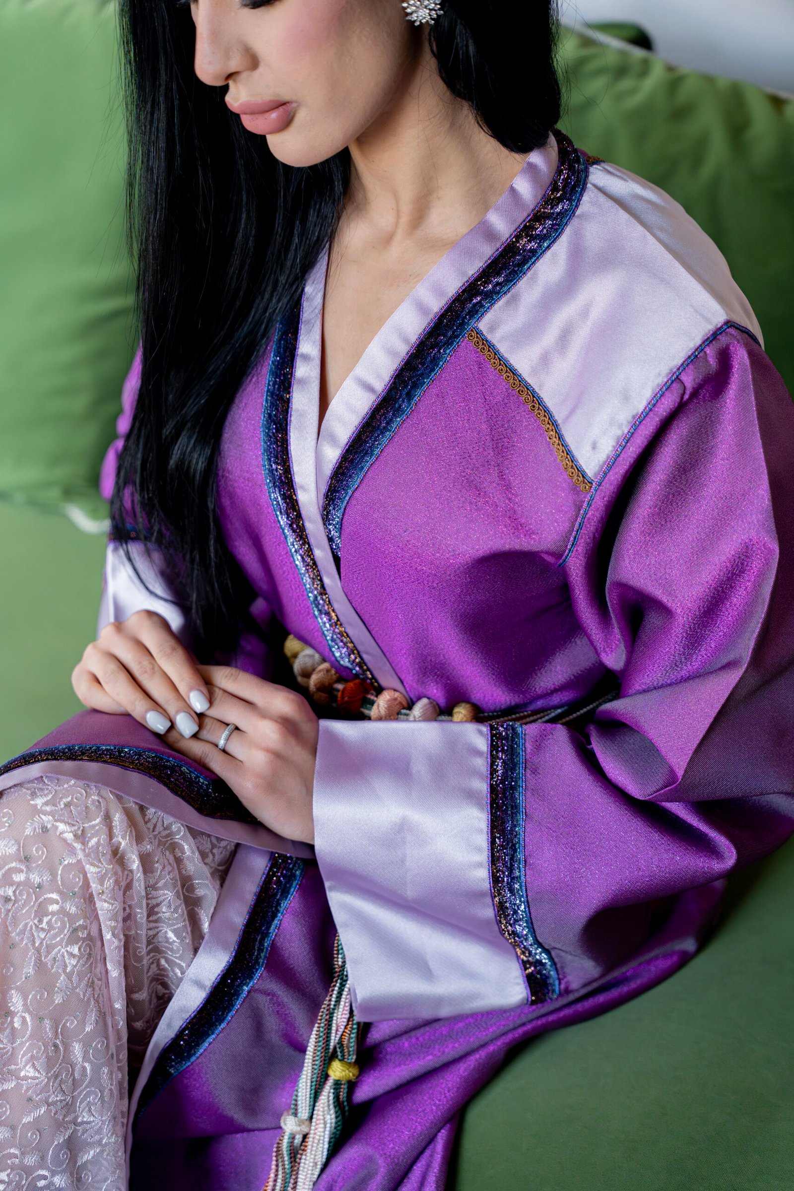A violet satin piece with refined contrasting finishes and a braided belt, combining fluid structure with precise Moroccan craftsmanship.